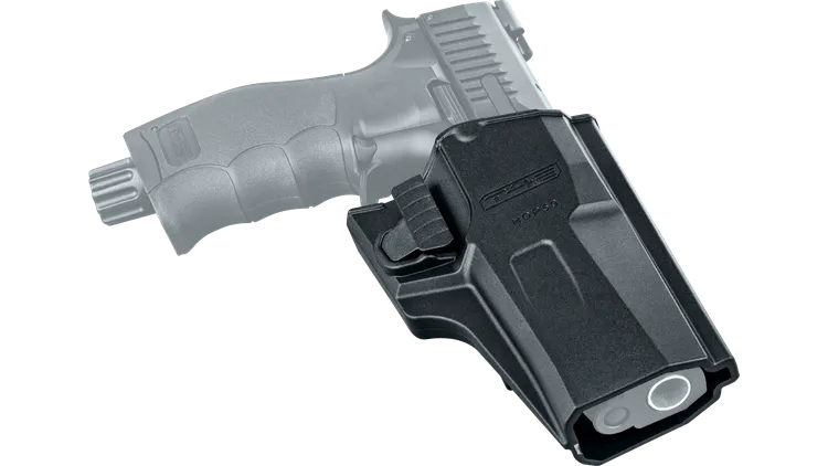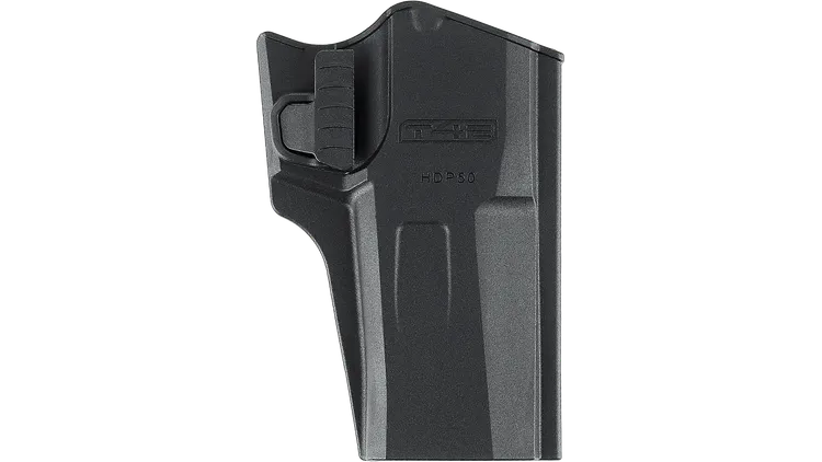 Designed to fit the T4E HDP 50, this paddle holster is made of impact-resistant polymer. The spring-loaded release button is in an intuitive position, and the belt attachment can be adjusted in height and matched to the belt width.