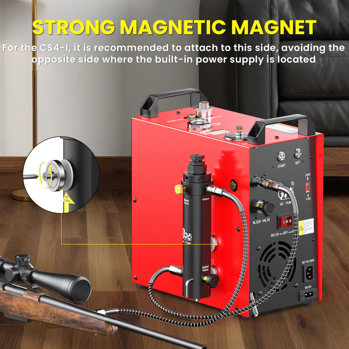 - Notice: When used with CS3-I or CS4-I models equipped with built-in converter, strong magnets may interfere with the power components. It is recommended to keep magnets clear of the built-in converter area. Refer to pictures which showing the area. For CS4-I, you can also attach to another compressor side without converter. For CS3-I, you can choose the bottom 2 magnet mounting holes.