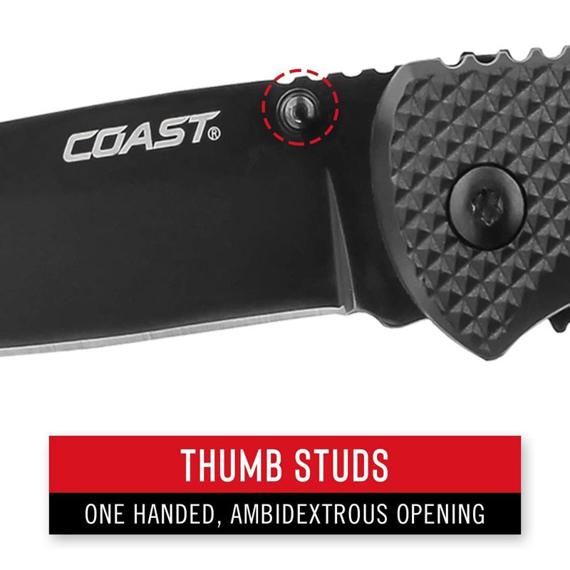 Lightweight EDC built for everyday carry, featuring a black finish 7Cr17 stainless steel drop point blade with an easy one handed ambidextrous thumb stud opening. Diamond-textured nylon handle with four prominent finger grooves and jimping notches for secure grip and control.