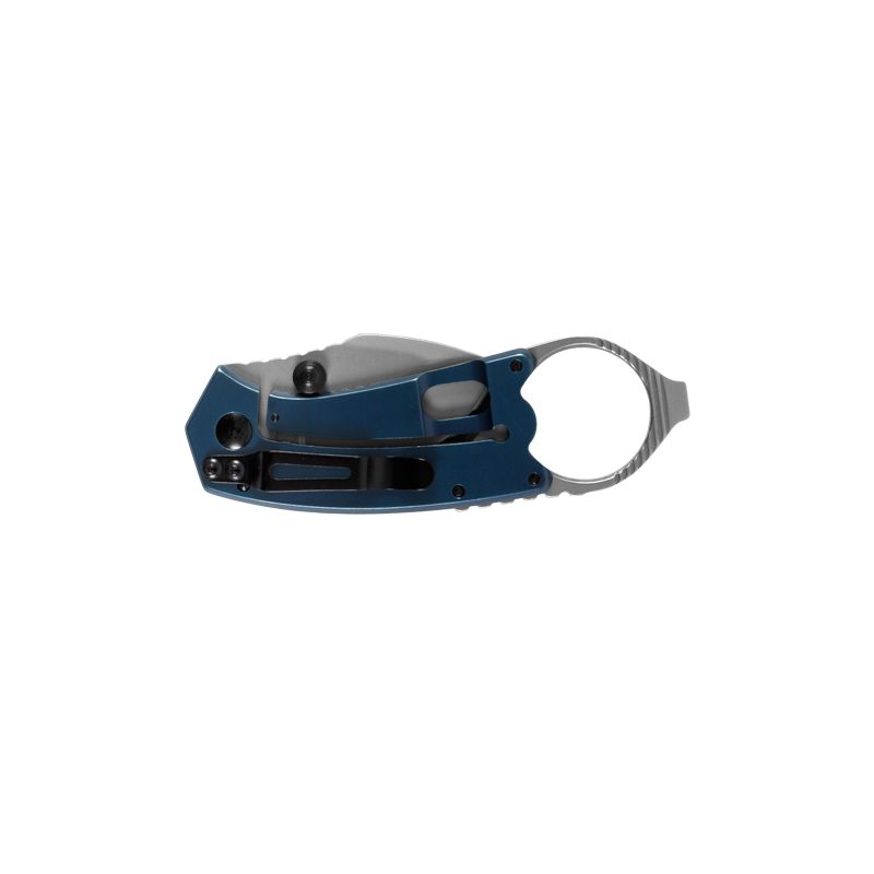 Versatile multiple tool, with a pinkie ring for a karambit-style grip at the base of the knife, which allows for a secure grip and doubles as a flat head screwdriver or mini pry-bar. Inside the ring, a small portion of the blue handle protrudes for use as a bottle opener. Ideal for right hand, tip-down carry if using the pocket clip.