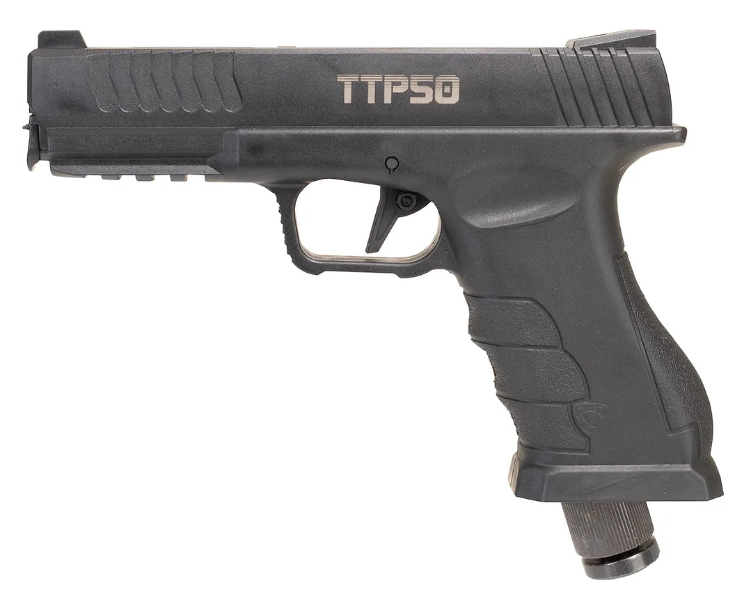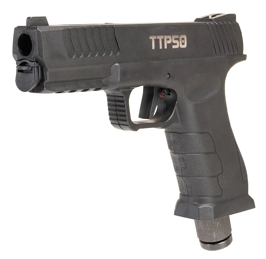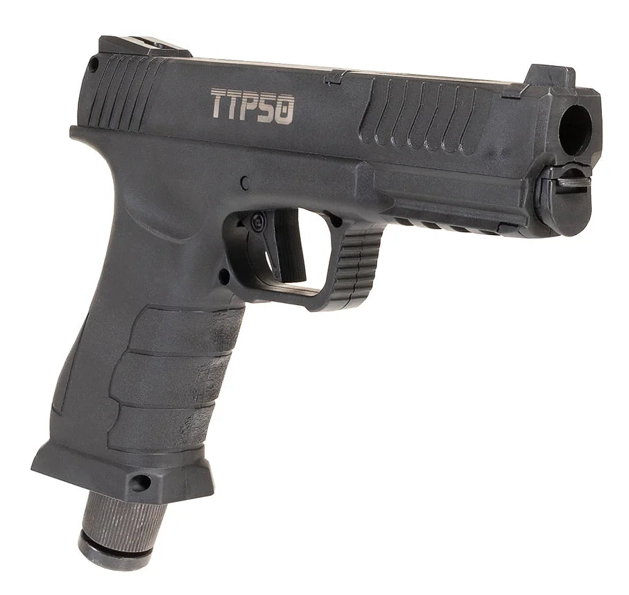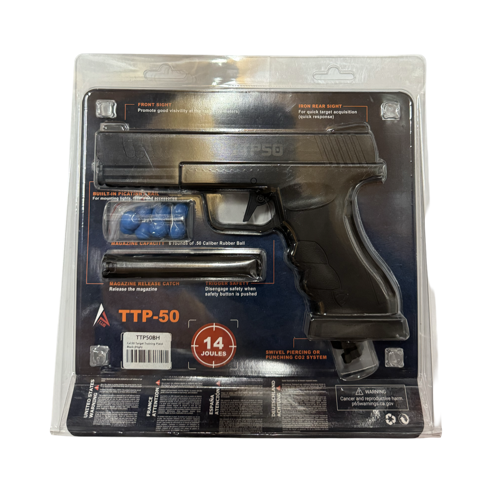 APS latest .50 caliber device – “TTP-50” is a co2 powered target training pistol that made in a handgun shape. The size is similar to a real handgun but much lighter due to its plastic structure. TTP-50 holds 6 rounds in the magazine and is powered by a single 12 gram non-threaded CO2 cartridge which gives you 360 FPS in factory production.