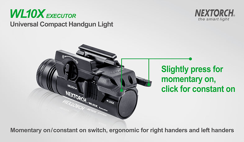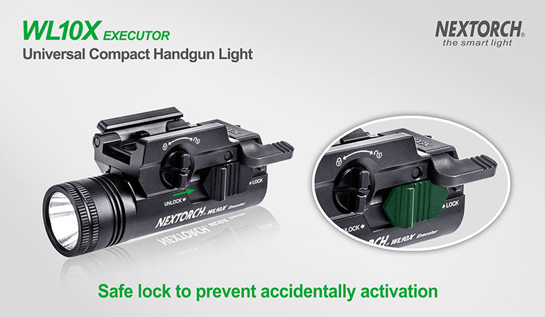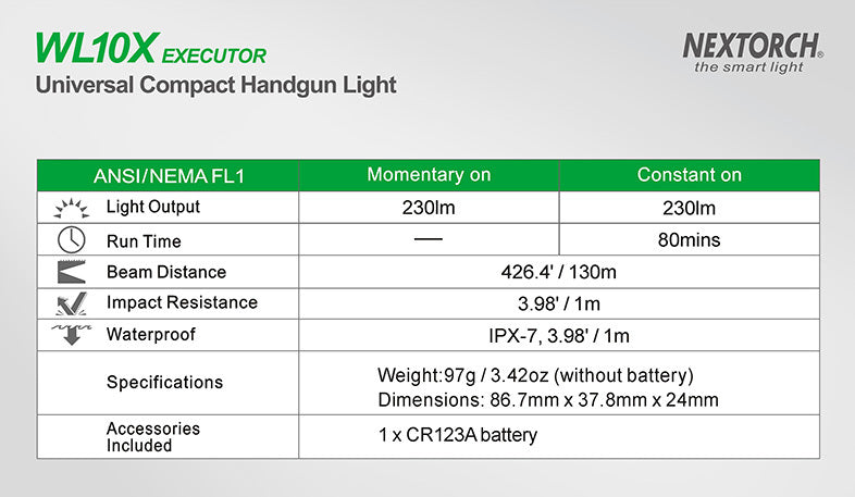 Specifications:FeaturesL 230 Lumen output, Ambidextrous momentary on/ Constant on switch. Patented quick attach/detach. Compatible with universal rails including picatinny. Specifications: LED: CREE XP-G R5. MODE: 23 Lumen. Runtime: 1h20min. Beam distance: 130m. Water proof: IPX-7(1m). Impact resistance: 1metre. Battery : 1 x CR123A (included). Dimensions: 87mm x 24mm x 22mm, Weight: 79gDescription: WL 10 Executor. Ultra Bright & Lightweight LED handgun light. Designed for law enforcement, military and more. The WL 10 is the most practical LED handgun light available, powered by a single CR123A battery and ready for your tactical and self defence applications . Its lighter and brighter, weighing only 74g and featuring an ultra-bright 230 Lumen output, with a flood beam bright enough for peripheral vision. Quick detach mechanism provides fast and secure locking to a Picatinny Rail. Compact, rugged and reliable, the WL10 Executor is your first choice for a handgun LED light.