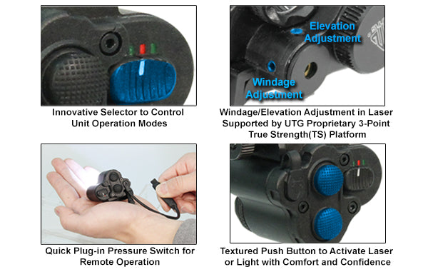 Innovative Selector Control with 3 Settings: a) Direct Activation Mode Activates Light and Laser Push-buttons, b) Pressure Switch Mode Activates Plug-in Pressure Switch Operation, c) Shut-off Mode Completely Deactivates the Unit Preventing Any Inadvertent Activation