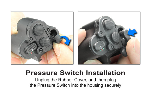 Strategically Positioned Remote Pressure Switch Plug-in Accepts Included Pressure Switch for Effective Remote Operation of Light, Laser or Both