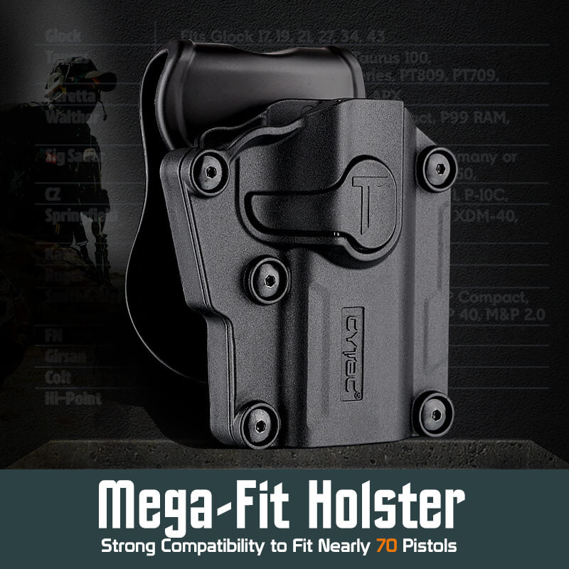 cytac Mega-Fit polymer holster features adjustable screws to fit 80+ Pistols. For users owning multiple guns, simple and effective design helps achieve a versatile usage. 360-degree rotation and option of 7 carrying ways make a perfect fit in every application.