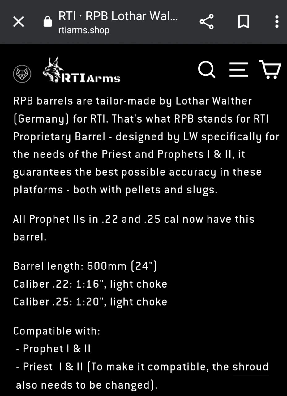 Featuring a 600mm lothar Walther 1:16 polygon barrel with a light choke and transfer ports never seen before to effectively discharge pellets and slugs. RPB barrels are tailored for RTI by Lothar Walther Germany.