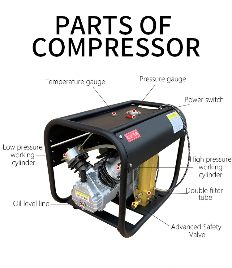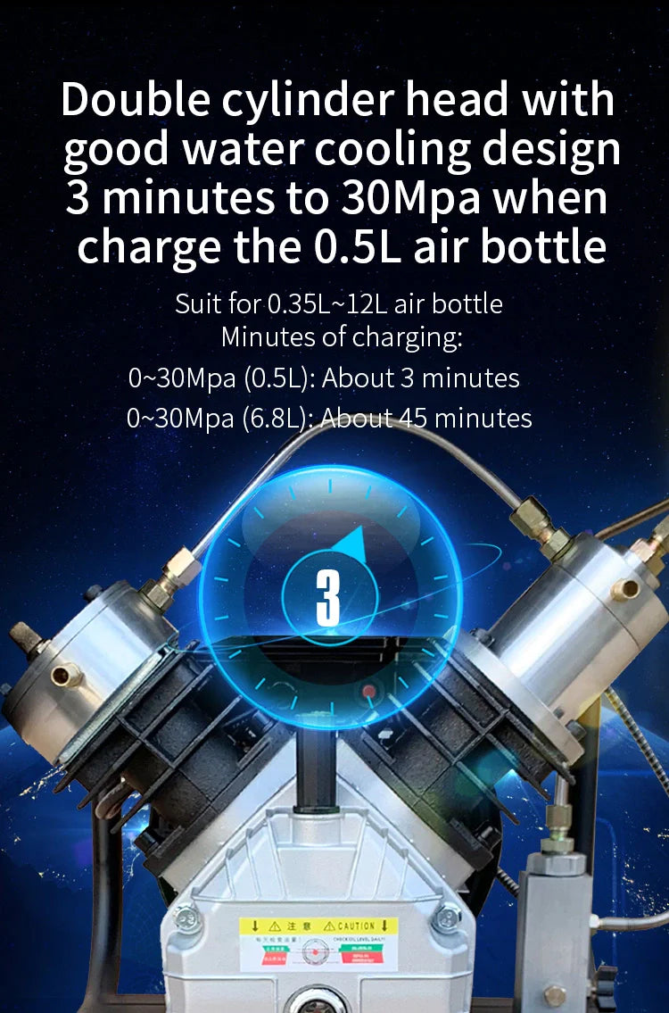 - ăSpecificationă: Voltage: 220v, frequency: 60Hz, power: 2.2kw, flow: 40L / min, working pressure: 30MPA / 300bar / 4500psi,Suitable for filling bottles with large capacity, it takes about 4 minutes to fill 0.5 liters from 0-300 bar and it takes about 51 minutes to fill 6.8 liters from 0-300 bar or a top up from 200 bar to 300 bar in 19 minutesÂ