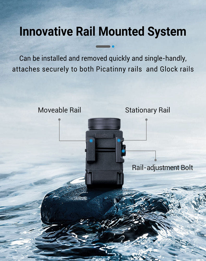 Can be installed and removed quickly and single-handedly, attaches securely to both Picatinny rails and Glock rails