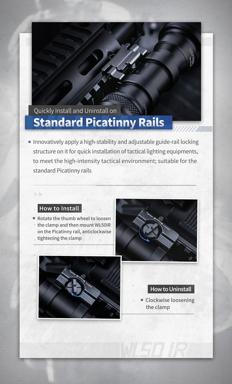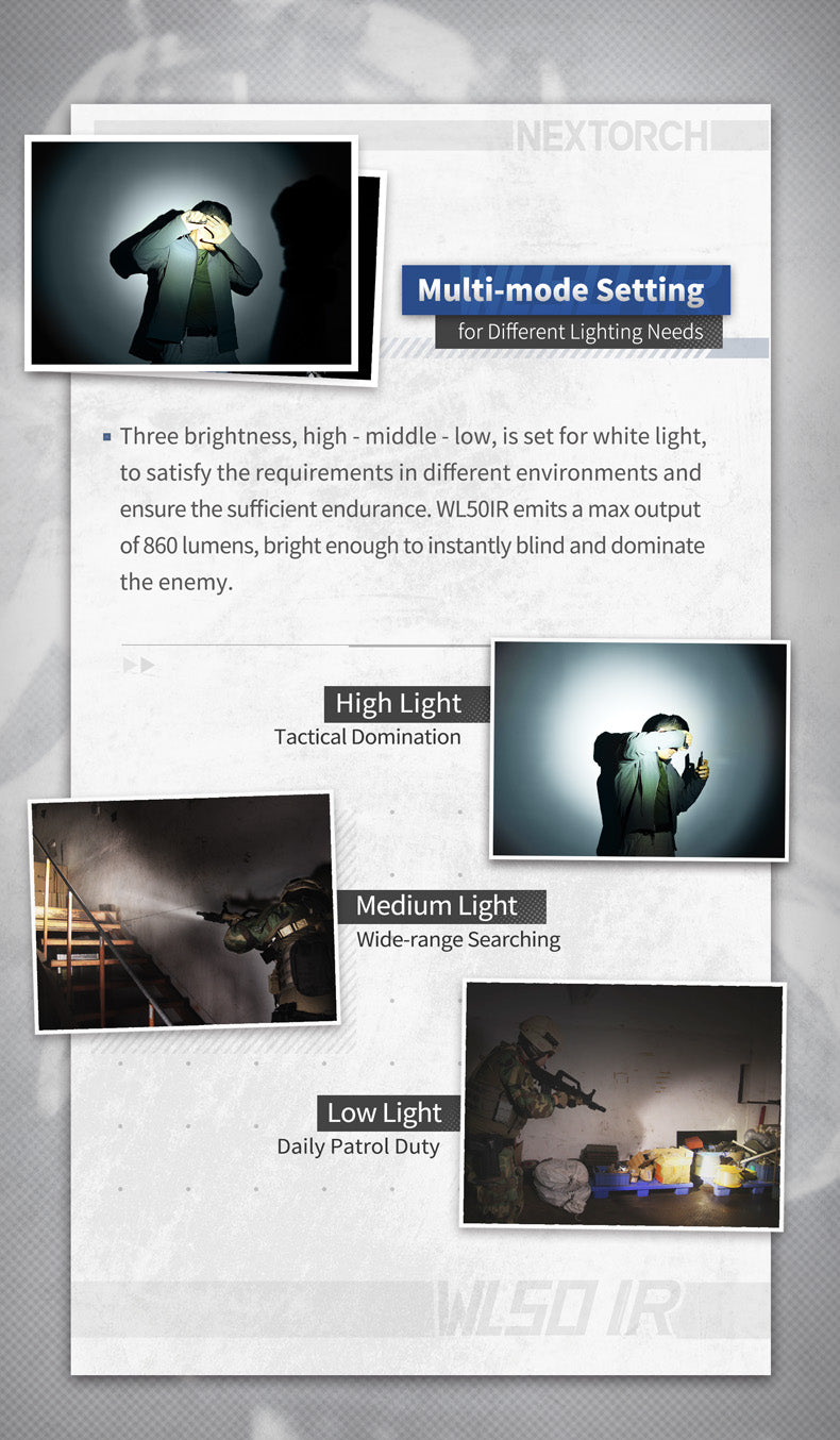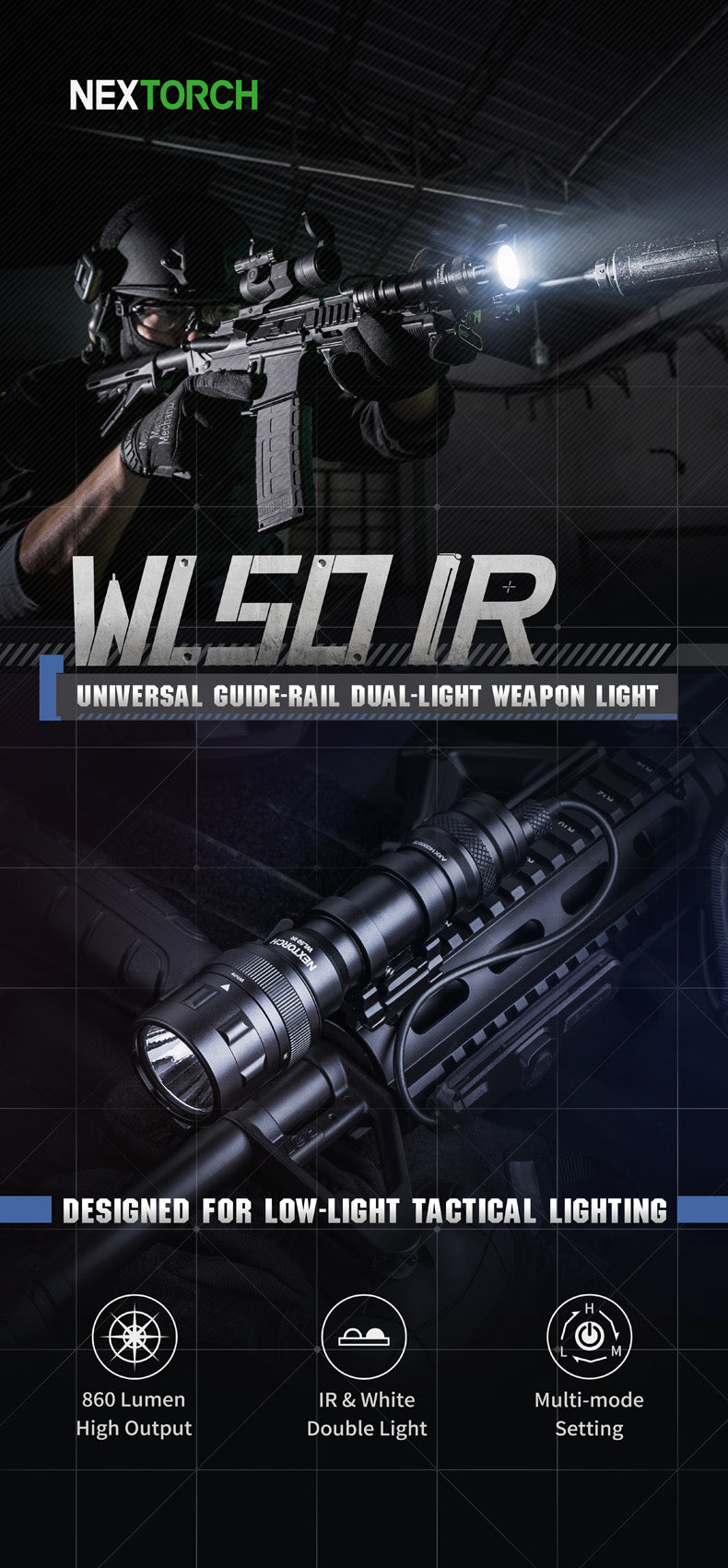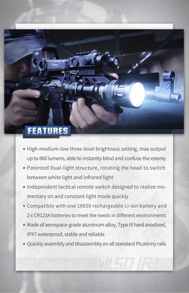 WL50IR is designed for low-light tactical lighting. It features high-medium-low three-level brightness setting, max output up to 860 lumens, able to instantly blind and confuse the enemy; patented Dual-light structure, rotating the head to switch between white light and infrared light; independent tactical remote switch designed to realize momentary on and constant light mode quickly. Wl50IR is compatible with one 18650 rechargeable Li-ion battery and 2 x CR123A batteries, able to meet the needs in different tactical environments. The main body is made of aerospace-grade aluminum alloy, Type III hard anodized, IPX7 waterproof, stable and reliable. Quick assembly and disassembly on all standard Picatinny rails available.