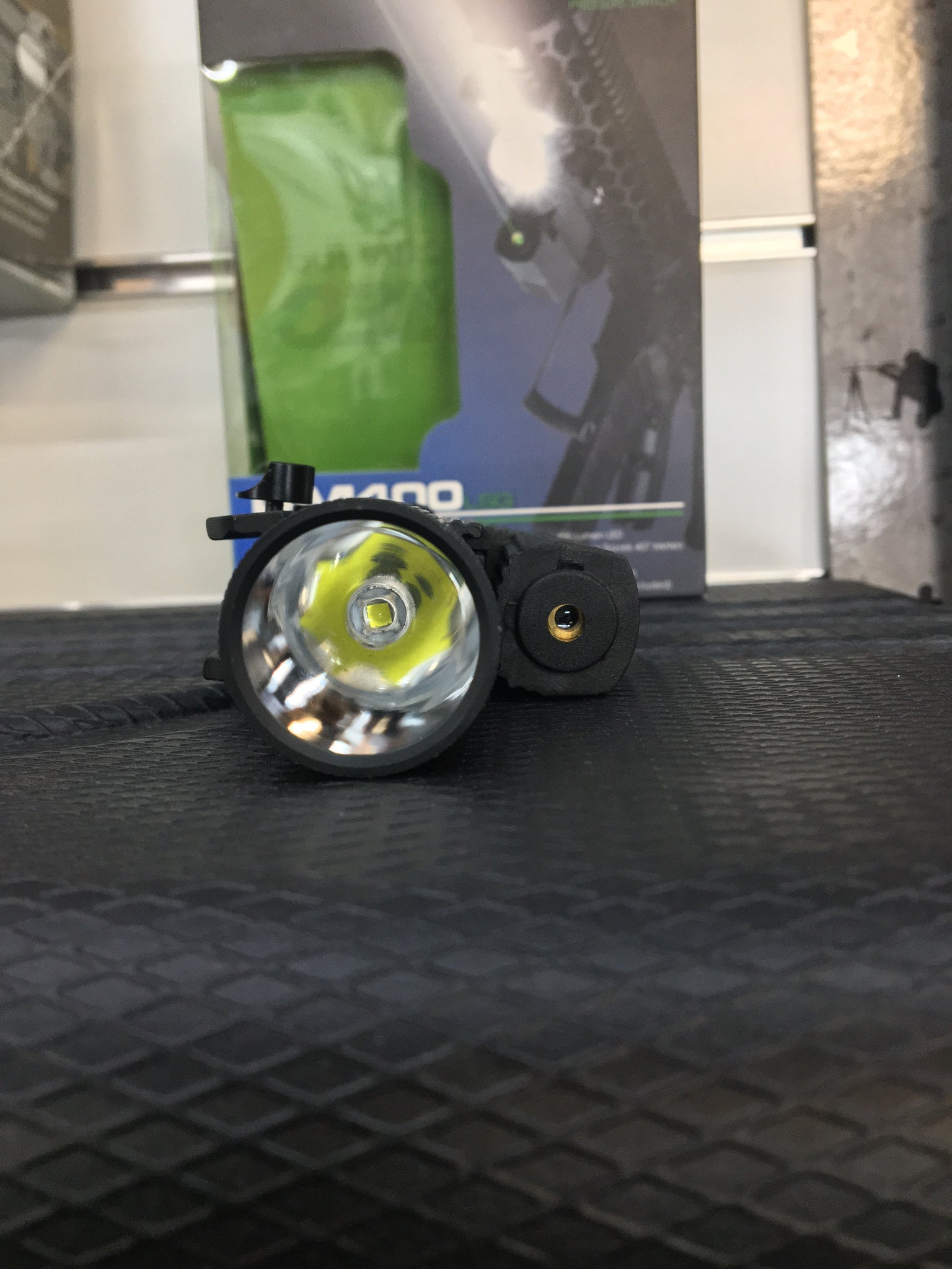 Dual-pressure switch offers high, medium, low, strobe and laser settings