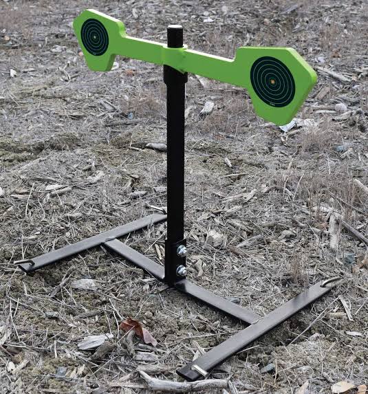 22 TARGET SPINNER » SPINS ON A HORIZONATAL AXIS WHEN STRUCK AND RETURNS TO THE SET POSITION. » LARGE STABLE TARGET BASE. » STEEL CONSTRUCTION. » .22/.17 RIMFIRE SPINNING TARGET. » GROUND SPIKES INCLUDED.